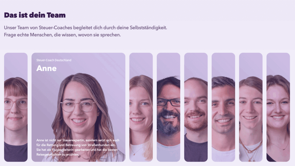 Wenn du auf steuerliche Herausforderungen stößt, unterstützen dich unsere Tax Coaches dabei, eine passende Lösung zu finden. Sie begleiten dich so lange, bis dein Anliegen geklärt ist. Anders als bei klassischen Steuerberatern, die oft stark ausgelastet sind und nicht immer direkt individuelle Beratung leisten können, kannst du dich bei unseren Coaches auf zuverlässige und engagierte Unterstützung verlassen, bei Bedarf auch in Abstimmung mit unserem Entwicklerteam.